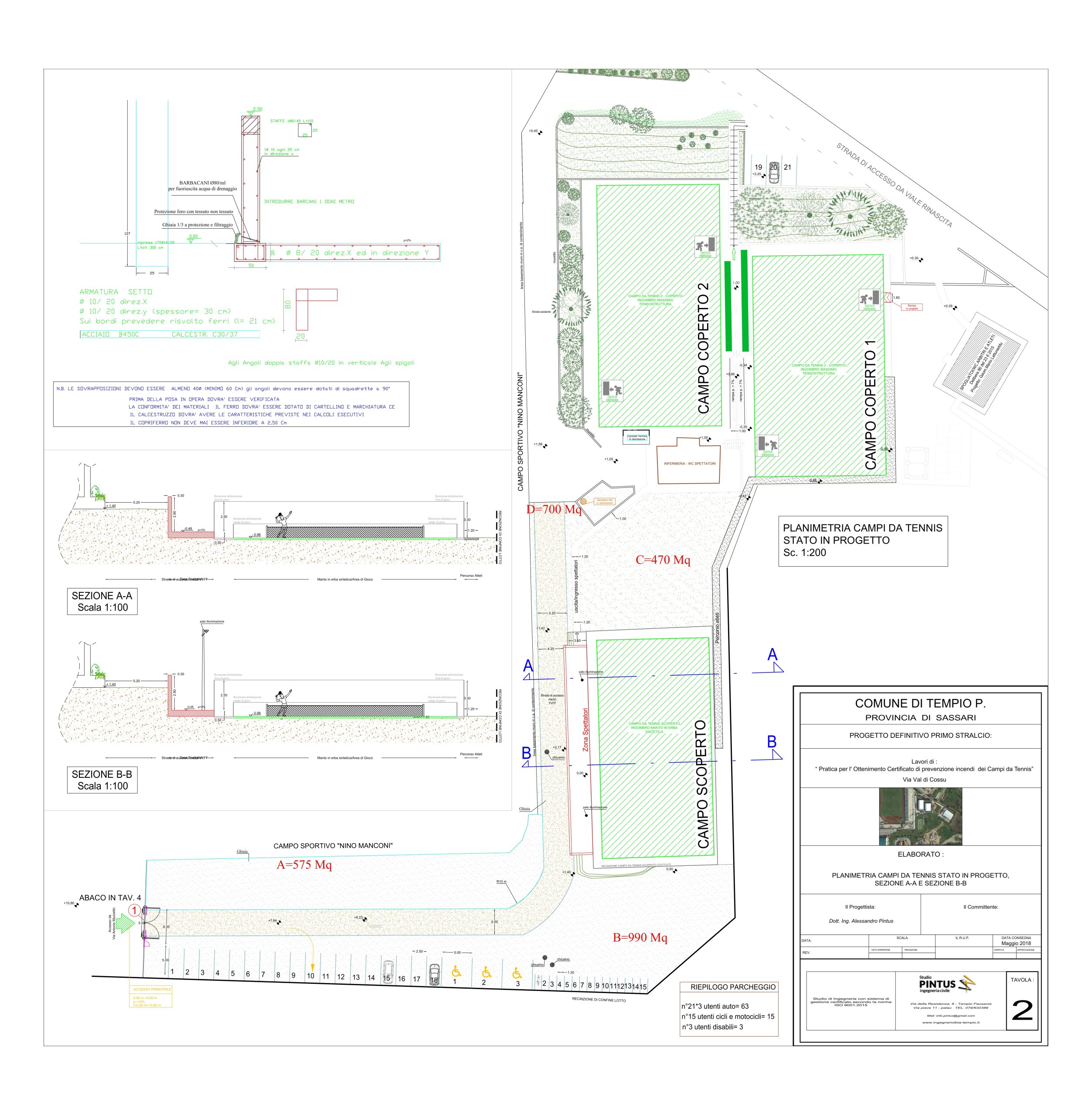 L’intervento dello Studio Pintus prevede un’analisi progressiva, la valutazione delle interferenze, caso per caso, prevedendo degli interventi progettuali e delle lavorazioni crono-programmate, senza impedire l’accesso alla struttura o modificare il normale svolgimento delle attività sportive e ricreative. L’accessibilità carrabile e l’ingresso in particolare, devono essere adattati alle dimensioni minime di passaggio dei mezzi di emergenza dei Vigili del Fuoco. La criticità procedurale più evidente è rappresentata dalla presenza di una centrale termica a Gas per il riscaldamento dei campi ad oggi non in funzione.